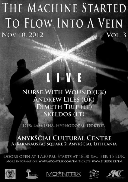 Anykščiai Culture House (A. Baranausko sq. 2) will host ‘The Machine Started To Flow Into A Vein (Vol. 3)‘ on November 10, 2012 at 17.30, presenting a legendary project of surrealistic electronic music – Nurse With Wound. The main artist of the band, Steven Stapleton, who has been actively performing since 1979 is highly influential in the experimental music scene. He has also collaborated with other artists and performed in Europe’s and USA’s largest festivals of alternative music.