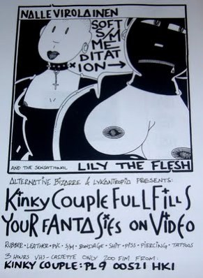 PURESTENCH : “Lily the Flesh” seemed to be a “turning point” for BU.The change wasn’t drastic but was very apparent. What was it about this tape that made you shift the sounds? Also, why did you choice the video Lily the Flesh out of all the XXX videos that are floating around out there?BU:“Lily The Flesh” was aimed for VHS-filth themed compilation, its on progress and I am not sure is it ok reveal details about it. So I shut my mouth. Anyway I went to bunker w/ VHS player and TV. the actual film plus few loose ideas. result was very pleasing, dirty and eerie. It came out such a long piece that it fitted better for BU full lenght release of own instead af compilation. “Lily The Flesh” was a homevideo made by NALLE VIROLAINEN and friends early 90`s .. 1991 maybe? Sold throught XXX magazine`s personal ads. S/M, Piercing, piss/shit etc. one female involved there “IIRIS” what a character, religious person.. Her Monoloque on film is brilliant(“Thank you Jeesus”) At one scene she is on leach as a dog, outdoor at one small park in Kallio, Helsinki. She starts to eat crass. another scene she is riding on Nalle`s cock and eating raw meat.Doing some animal sounds. hah! IIRIS gave paid sessions back then I gave her a call few times but didt had guts to go see her. She seemed a bit unbalanced person. That was the main reason I decides not to go. NALLE VIROLAINEN was editor of “CHAINS” S/M zine and “LYKANTROPIA” film zine late 80s and one of maker of “ROSKAELOKUVAT” book. Throught his writings I got introduced to ILSA, Cannibal films, Nekromantik, sadism and masochism etc. everything a kid need to grow up. I was 13-14 at time I ordered his zines.